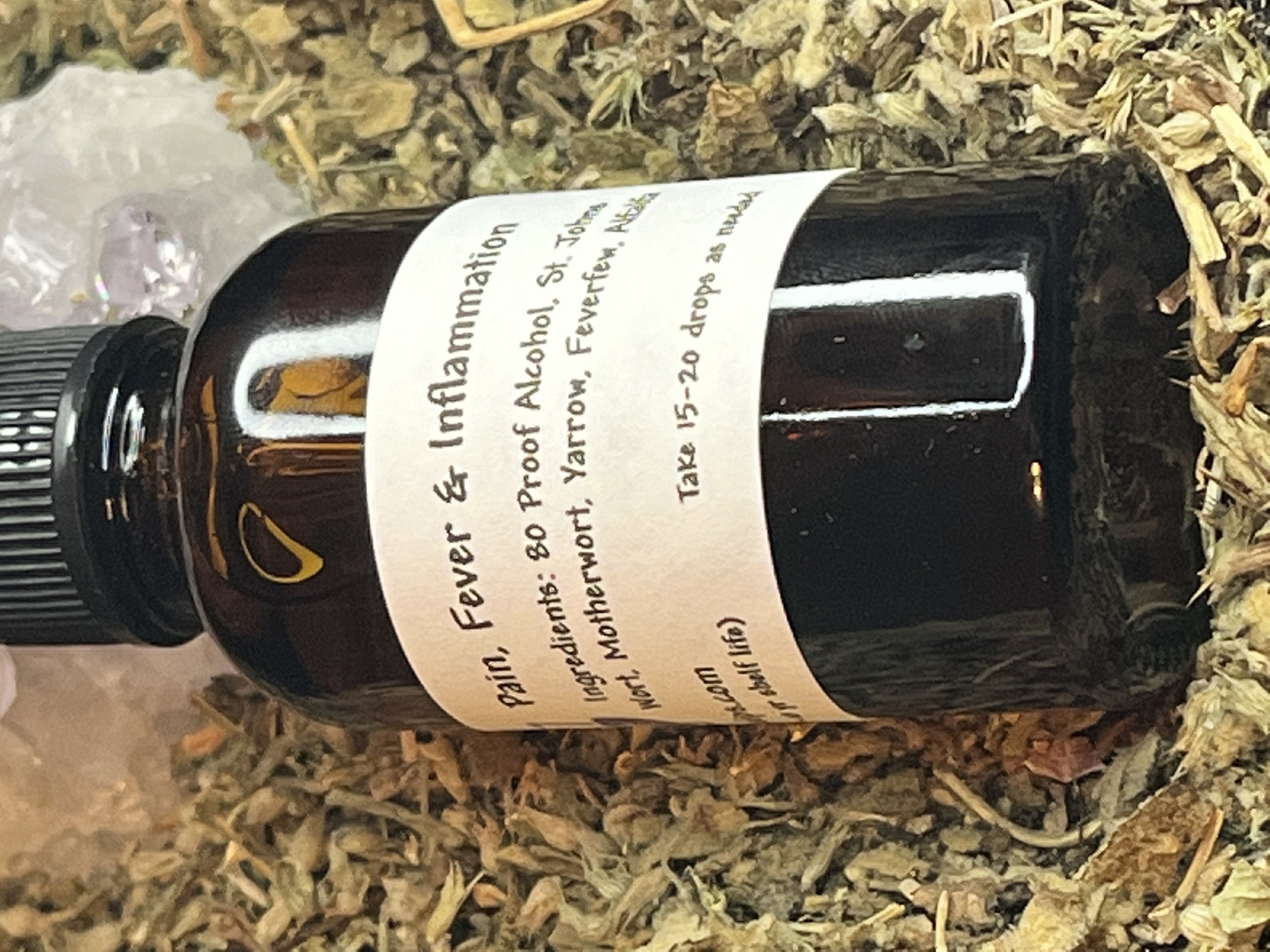 This pain, fever, and inflammation tincture is the perfect combination of St. John’s Wort, Motherwort, Yarrow, Feverfew, & Alfalfa for relive from pain and help rid of fever and inflammation. These herbal properties have been extracted by soaking in 80 proof alcohol for up to 6 weeks.